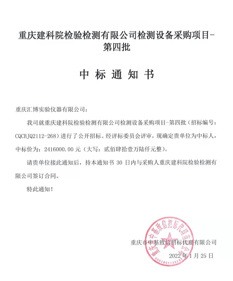 重慶建科院檢驗檢測有限公司委托重慶市中基致信招標代理有限公司對我公司檢測設備采購項目(項目號:CQCBJQ2112-268 )重慶建科院檢驗檢測有限公司檢測設備采購項目-第四批進行了公開招標采購,現已完成全部采購程序。確認重慶匯博實驗儀器設備有限公司為檢測設備采購項目-第四批中標人,中標價為2416000元(貳佰肆拾壹萬陸仟佰元整)。