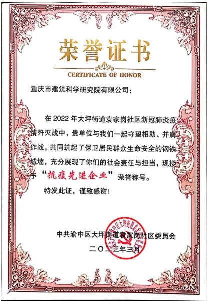 3月23日,大坪街道召開“疫”路有你,與愛同行——暨抗疫“最美黨員”表彰大會,為在2022年大坪街道袁家崗社區(qū)新冠肺炎疫情殲滅戰(zhàn)中表現(xiàn)優(yōu)秀的社會團體與個人頒發(fā)榮譽證書,市建科院公司獲“抗疫先進企業(yè)”榮譽稱號。