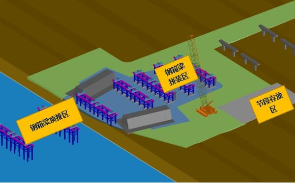 為避免河道水資源污染,確保航道通暢,箱梁采用整節(jié)段拼裝、頂推施工工藝。主橋鋼結(jié)構(gòu)現(xiàn)場施工分為鋼箱梁頂推和拱肋吊裝兩部分,鋼箱梁塊段運輸至現(xiàn)場的拼裝支架上組拼成大塊段節(jié)段,焊接完成整體后進(jìn)行頂推施工(鋼箱梁頂推施工期間, 18#、21#墩引橋側(cè)高蓋梁暫不施工,主橋側(cè)支座墊石正常施工),依次循環(huán),直至鋼箱梁全部頂推完成。拱肋放置于鋼箱梁對應(yīng)位置一同頂推到位,鋼箱梁整體落梁至頂推臨時支架上,2臺400t履帶吊上橋進(jìn)行拱肋支架安裝和拱肋安裝。過程中通過整體頂推設(shè)備控制程序自動調(diào)節(jié),確保設(shè)備的協(xié)調(diào)同步。