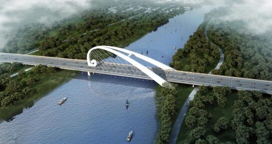 香河縣安石路(運河大道-冀京界段)建設(shè)工程是《北京市通州區(qū)與河北省三河、大廠、香河三縣市協(xié)同發(fā)展規(guī)劃》的重點工程,也是北運河廊坊段旅游通航的重要組成部分,路線全長3.624公里,采用一級公路兼城市主干路標(biāo)準(zhǔn)建設(shè),道路標(biāo)準(zhǔn)橫斷面采用四幅路形式,雙向六條機動車道,外設(shè)非機動車道和人行道,路基寬47米。其中橋梁段(即王家擺大橋)長1060.1米(主橋長256米,引橋長804.1米),采用抱翅型拱梁組合體系,由“Λ”字抱翅外形的空間異形主拱拱圈、拱圈內(nèi)與主梁連接的斜吊桿和主梁三大主體結(jié)構(gòu)組合而成,主梁半幅為整體鋼箱,半幅之間用橫梁連接,拉索錨固在抱翅拱和主梁的橫梁上,橋面板采用正交異性鋼橋面板。抱翅拱的一端在中央隔離帶處與主梁橫梁連接,下接中墩支座;抱翅拱的另一端成“Λ”形分布于主梁兩側(cè),通過橫梁與主梁連接。造型創(chuàng)意以如意型浪花為構(gòu)思元素,將運河之水奔流涌動之態(tài)和如意的古典華美抽象融合,建成后將成為當(dāng)?shù)匾蛔鶚O富美感的景觀橋。