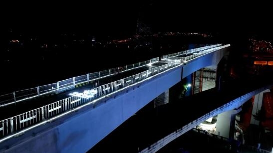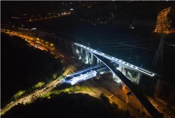 為最大程度減少對運營線路的影響,縮短建設(shè)工期,保障施工安全,項目部決定采用橋梁轉(zhuǎn)體工藝進(jìn)行施工,即在6號線兩側(cè)將T構(gòu)連續(xù)梁澆筑完成,以橋墩為軸逆時針轉(zhuǎn)體,跨越既有6號線進(jìn)行對接。7月28日1時56分,6號線東延工程劉家坪站至百樂園站高架區(qū)間的兩座T構(gòu)連續(xù)梁轉(zhuǎn)體橋開始轉(zhuǎn)體施工,經(jīng)過52分鐘的轉(zhuǎn)體作業(yè)后,實現(xiàn)精準(zhǔn)對接,這既是6號線東延工程高架區(qū)間首座連續(xù)梁轉(zhuǎn)體,也是重慶軌道交通領(lǐng)域首次實現(xiàn)連續(xù)梁跨越既有軌道交通線路轉(zhuǎn)體,為后續(xù)類似施工提供了范本。