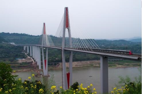 蔡家嘉陵江軌道專用橋?yàn)殡p線軌道雙索面斜拉橋,全長(zhǎng)1250米,由南北引橋和主橋組成,橋跨為連續(xù)梁、雙索面斜拉橋、連續(xù)鋼構(gòu)引橋組成,其中主橋長(zhǎng)640米、主跨250米、主橋面距河床距離100米。在設(shè)計(jì)時(shí)兼顧了功能性、景觀性以及可實(shí)施性,最終選擇了與環(huán)境協(xié)調(diào),經(jīng)濟(jì)實(shí)惠、施工可實(shí)施性強(qiáng)的斜拉橋,由于橋墩高、橋面窄,主橋?qū)挾认鄬?duì)于普通的跨江公路大橋更窄,橋身顯得纖細(xì),在云霧中呈現(xiàn)婀娜多姿的柔美姿態(tài)。